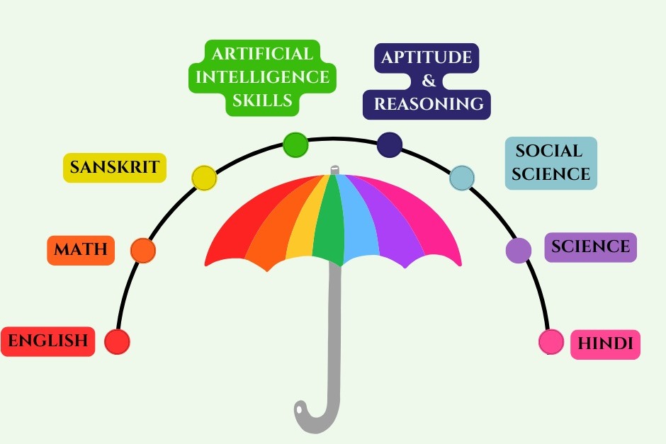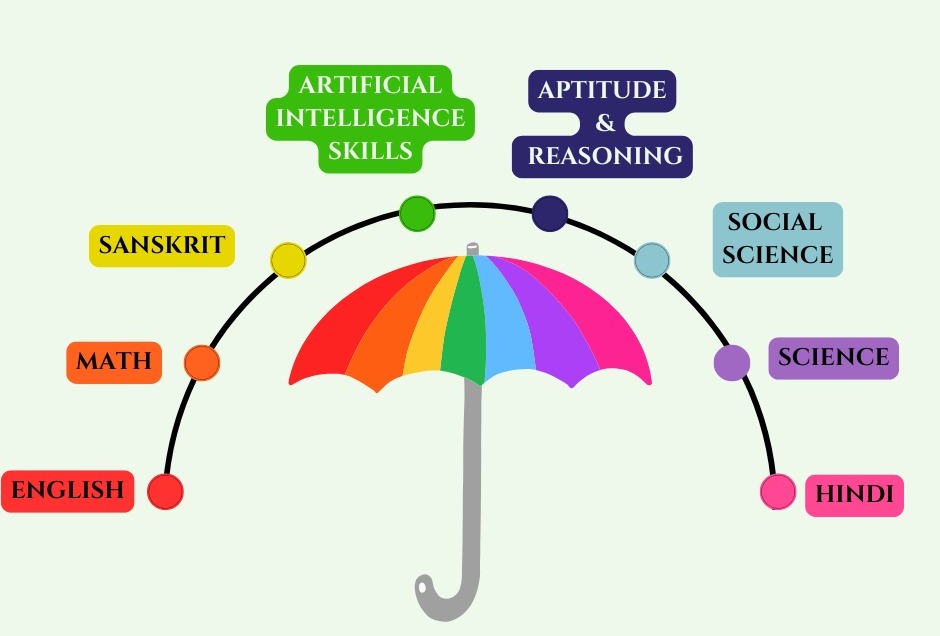 English, Hindi, Math, Science, Social studies, Sanskrit, Aptitude and reasoning, and Artificial intelligence.