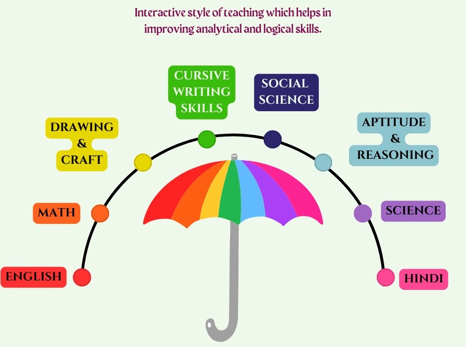 English, Hindi, Math, Science, Social studies, Aptitude and reasoning, Drawing and craft, Cursive writing